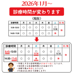 10月末から院内掲示やご来院された方へは案内を行っておりましたが、2026年1月より、診療時間が一部変更となります。