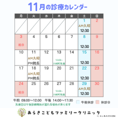 11月は以下の日程で診療体制が変更となりますので、お知らせいたします。